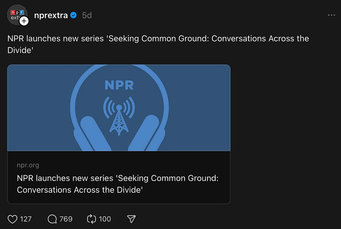 everyone should ‘normalize’ Donny? are you kidding me? there is nothing normal about Preznit Fuckwit. festooning every square inch of the Oval Bordello with gold-plated tat is not normal. bulldozing a third of the White House to build a vulgar dance hall is not normal. nor is falling asleep every time you’re out in public. nor is slapping your stupid name all over every public monument. nor is prosecuting your political ‘enemies.’ nor is selling pardons for millions of dollars — which is a thing that Donny and his family are doing, right under our noses. none of that shit is normal, and it’s dangerous and delusional to pretend otherwise. so, again, here we are, a year later. did normalizing Donny’s behavior work? of fucking course it didn’t. there no satisfying a power-obsessed narcissistic Mad King. every time you let Donny get away with something, that just emboldens him to do something worse. normalizing fascism is how fascism wins. here was NBC News’ entry in the Wishcasting Olympics. NBC News actually had the temerity to ask if Todd Blanche — Donny’s personal lawyer who he named to the number two post at the Department of Justice — would tell Donny no when he ordered Todd to fuck shit up. spoiler alert: Blanche, who is now Deputy Attorney General — still functions as Donny’s personal lawyer. right now, he’s doing his best to ensure that the Dead Pedo Bestie files get slow-walked into oblivion, and that any files were do see are so redacted as to be meaningless. lucky for us, the entire DOJ is incompetent as fuck. now, what in the small-batch artisanal fuck did NPR imagine they were going to accomplish here? “NPR launches new series ‘Seeking Common Ground: Conversations Across the Divide’” oh how lovely, NPR was going reach across the divide and seek common ground — with the very people who were vowing to starve NPR of existence. “we’ll be looking at everything from government-funded media programs like NPR that spread nothing but Democrat propaganda.” spoiler alert, from July 18, 2024.