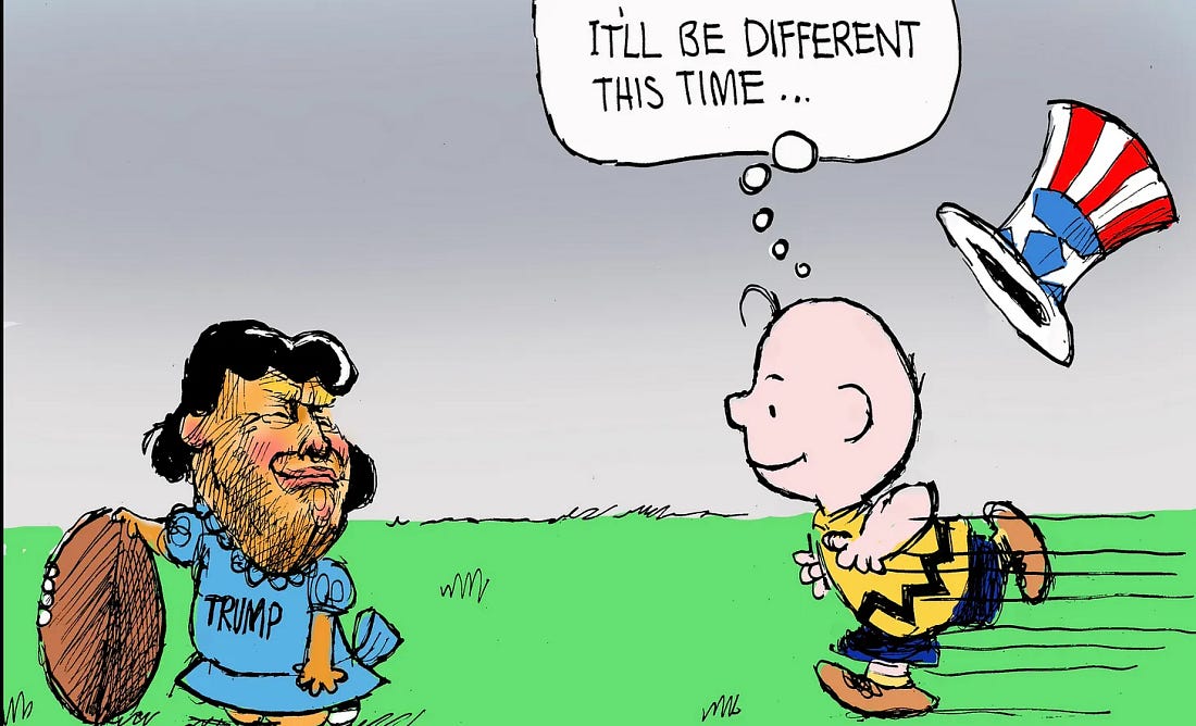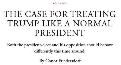 after the election, the press went into overdrive, churning out piece after piece in which they promised us that if we all click our heels together three times, everything will be okay. this was all so fucking delusional. Donny’s first term was a dumpster fire of corruption, mismanagement and mass death — but somehow, now given a second chance to fuck shit up worse, Donny was going to bring us an ‘American renewal’? oh my god, we’ve been hearing this fever-swamp fairy tale since Donny came down that accursed golden escalator in 2016. during his first term — over and over — every time Donny stopped short of taking out his dick and pissing on the floor, the press would fall all the fuck over itself in a mad dash to proclaim him presidential. here’s another spoiler alert: Donny never became presidential. not from the the first time he threw a ketchup-hurling tantrum in the White House, to the moment he absconded back to his Florida golf motel, taking with him boxes of stolen classified documents. and now, during his current term? Donny’s only gotten worse. here’s another slice of post-election shitwaddery from The Atlantic. the premise here was that if we’re respectful to Donny — if we fucking kowtow to him, and stop opposing him — he’ll be nice to us in return. he’ll become — dare I say it? — presidential.