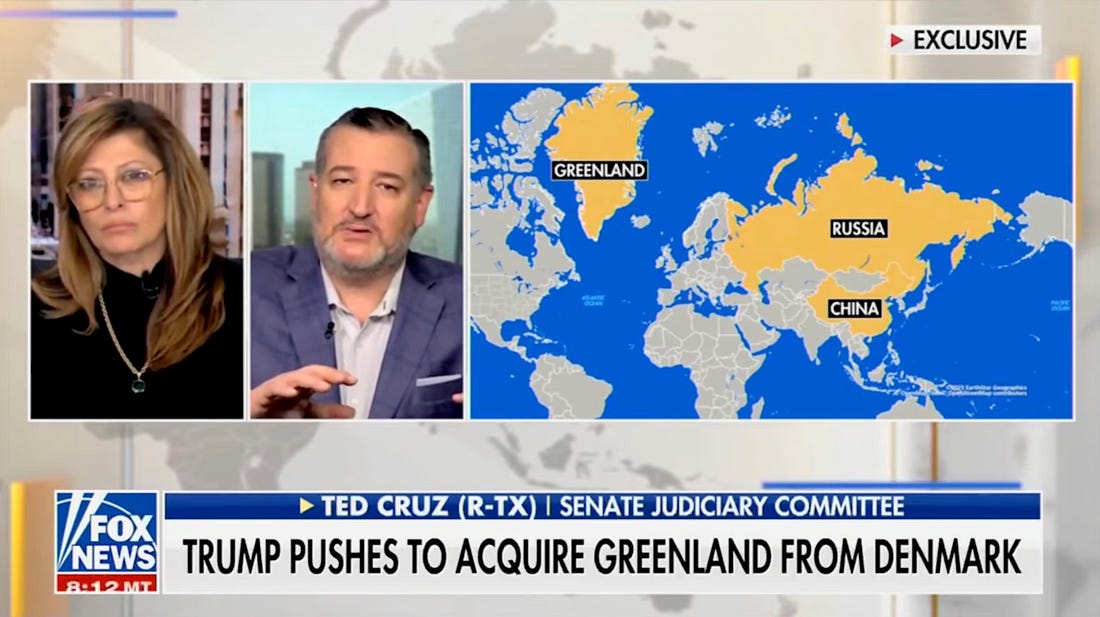 This morning on Fox, two well-matched intellects: Maria Bartiromo and Ted Cruz. Next to them is a Fox-produced map making Greenland look bigger than China, which in reality is more than four times its size. And on a par with the whole of Africa, which in fact is nearly 15 times as large. Fox is famous as the main source of real-time intel for the person who has assumed one-man control of US military, economic, and diplomatic relations with the world. What could go wrong? (JF screenshot.)