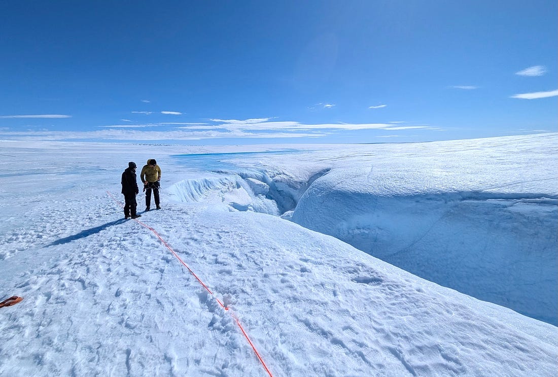 Hoping that my wife Deb, at left, doesn’t fall into an ice crevasse, at right. (JF photo.)