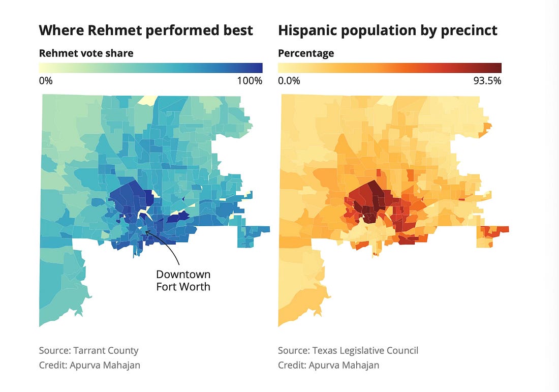A Texas Tribune analysis of precinct-level results shows that Rehmet won by an average margin of 59 percentage points in the voting precincts where more than 60% of the population is Hispanic. In 2022, the Democratic nominee, Gwenn Burud, carried those same precincts by a much narrower 26-point average margin.