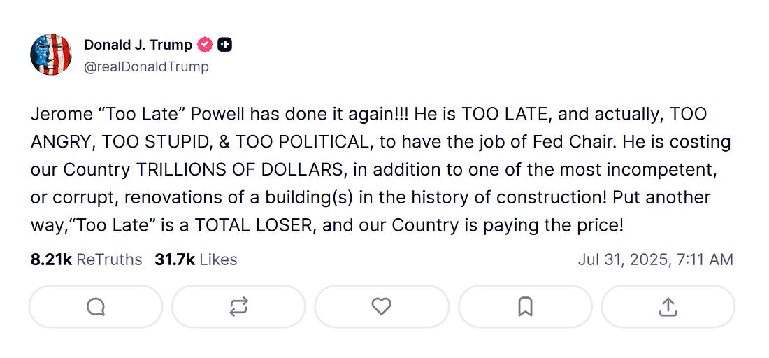 Trump’s chief instigator is Bill Pulte, director of the Federal Housing Finance Agency and the chairman of Fannie Mae and Freddie Mac, who spends his days spelunking through confidential financial documents looking for dirt on Trump’s enemies. He’s the one who came up with the allegation that Federal Reserve Board Member Lisa Cook had lied on a mortgage application, justifying her termination “for cause” and freeing up Trump to install someone more pliant. With Powell, Pulte seems to have settled on cost overruns in the renovation of the Federal Reserve buildings as a convenient excuse.