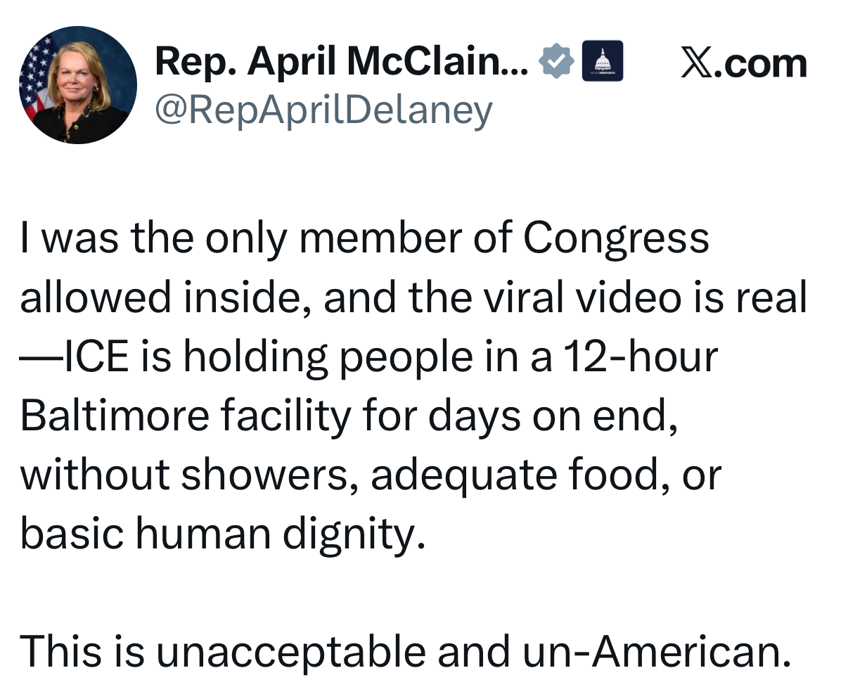 There were more revelations today about the horrific conditions inside of ICE facilities and DHS’ attempts to purchase warehouses and turn them into what can only be described as concentration camps. Maryland Representative April McClain visited one facility and had this report: