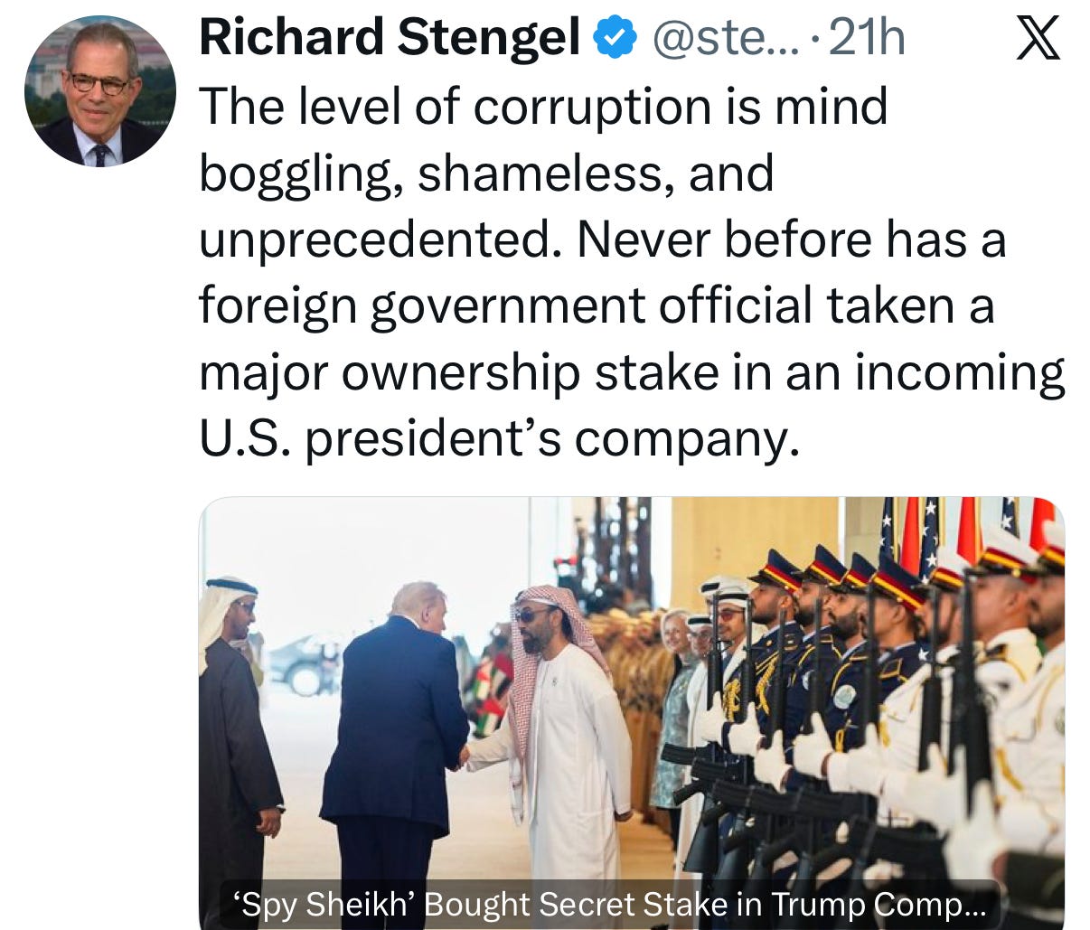 Then there are the corruption allegations involving Trump and investment from foreign governments. The Emoluments Clause seems to be so dead that no one even mentions it anymore. The headline read, “Spy Sheikh’ Bought Secret Stake in Trump Company.” The story involves a $500 million investment that was made in a Trump company—after long withheld permission to let the United Arab Emirates purchase American AI chips was granted.
