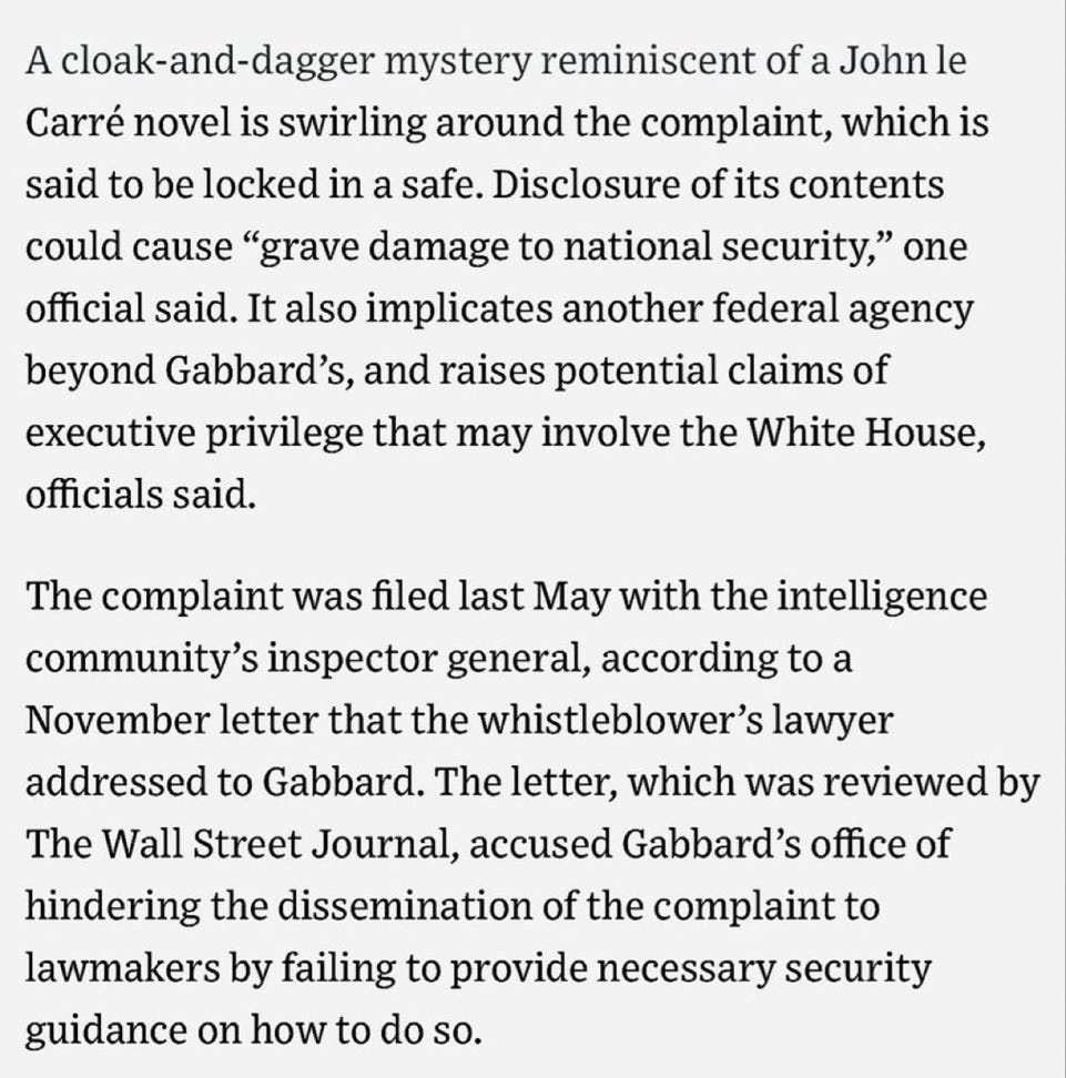 There was also a report this morning that a mysterious whistleblower complaint was filed eight months ago, accusing Gabbard of some unidentified misconduct. The complaint has been kept from Congress, on the excuse that it’s “extremely classified” and may involve “executive privilege.” Gabbard denied the allegations and said she was trying to figure out how the complaint could be shared with members of Congress.