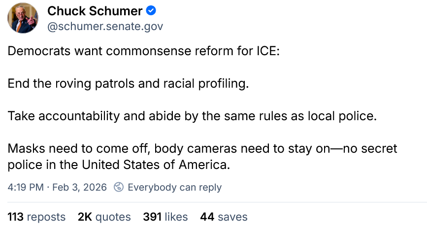 The impasse is centered on DHS and, more specifically, ICE and CBP. Representative Ro Khanna said he’s a “firm no” on reopening the government and questions how Democrats “in good conscience” can vote to continue ICE funding. It remains to be seen just how many others share his view.