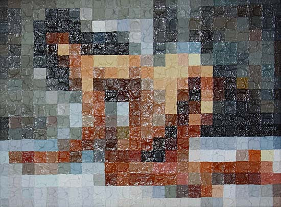 The portrait Cogan offers of life as a ‘bachelor girl’ looks like loads of fun. There's nothing in here about paying the rent or even getting dressed. The world she shows us is one of pleasure and self-absorption with occasional drop in visits from like-minded nude males. When she's not eating or playing suggestive games with hand puppets, Cogan's bachelor girl lounges around talking on her cell phone and hugging her cat. And she stays voluptuous and pretty, no matter how many Hostess cupcakes and Pop Tarts she eats. What a life. The character Cogan creates is sort of a 21st-century female Hugh Hefner in much scantier pajamas. The trick here is that she's Playboy centerfold and playgirl all at once. She gets to keep her cake and eat it too. All this would just be propaganda for a point of view no one seriously disagrees with anymore except that Cogan's rendering is so appealing and so deftly integrated with the vintage fabrics she uses that the effect ends up being more than just the sum of its parts. The works are both decorative and witty. The embroideries are fairly primitive, made of neat basting stitches that clearly draw her subjects but without any of the subtlety of the originals that earlier generations of women sweated over with cramped fingers.