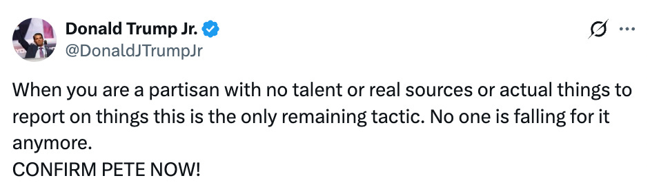 When Defense Secretary Pete Hegseth’s nomination was imperiled due to rape allegations, Trump Jr. emerged as one of his most outspoken defenders.