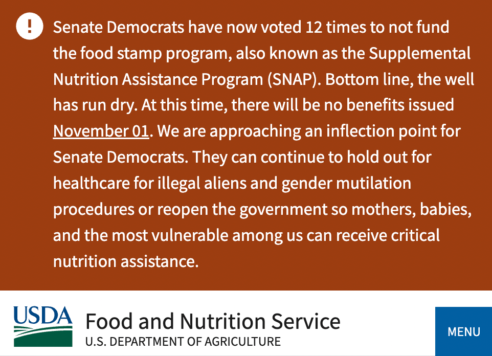 The official website of the U.S. Department of Agriculture (USDA) claims that on November 1, the Supplemental Nutrition Assistance Program (SNAP) will run out of funding. The USDA asserts that Democrats are blocking funding to secure “health care for illegal immigrants” and funding for “gender mutilation procedures.”