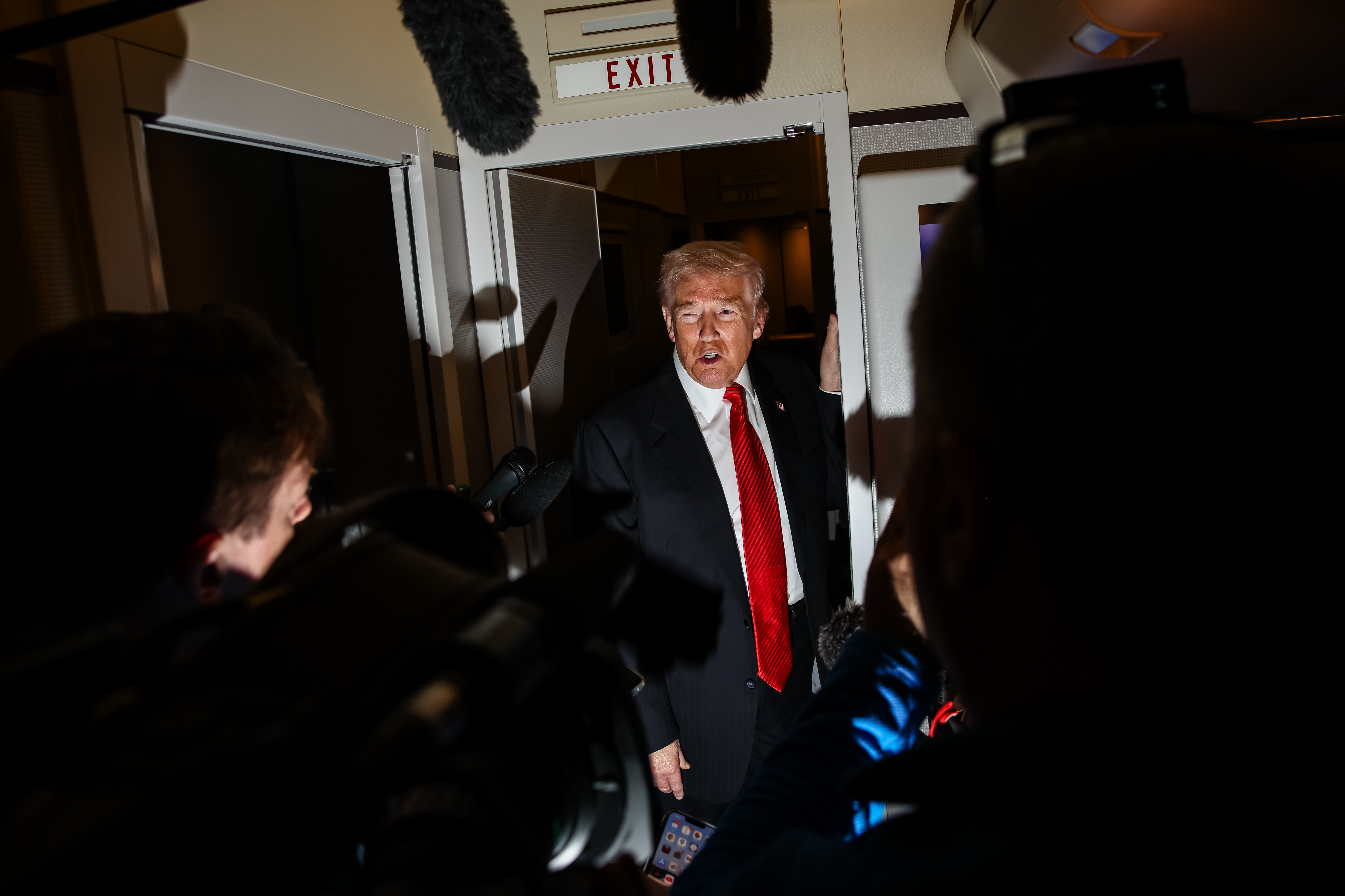 Donald Trump speaks to reporters aboard Air Force One en route to the White