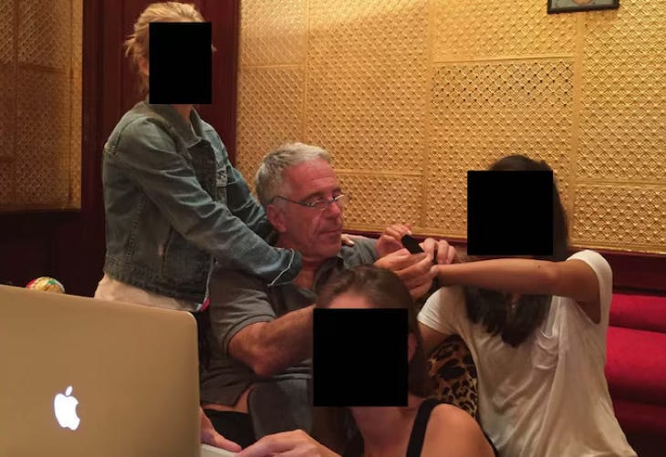 The girls, perhaps some who are sick and pumped full of Phenazopyridine, surround Epstein in many of the pictures that have been released—timidly, fearfully tending to their abuser, unable to escape his predatory grip, stuck in a miasma of relational pain with him. Hidden in his sexual dungeon of torture, disguised by its golden opulence, either on his private island or tucked away in his massive Manhattan mansion, the pedophilic capitalist is at the top of his game, subjugating those from one of the most vulnerable populations in the system: girls.