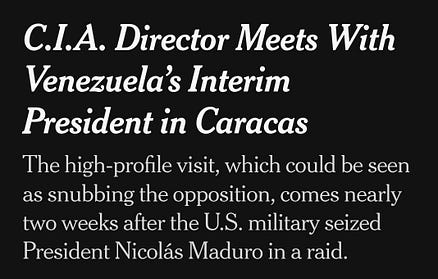 but you know that stupid things like facts aren’t going to stop Donny from strutting about, and never shutting the fuck up about how he ‘won’ the prize. it’s all so eternally embarrassing. aren’t you tired of watching Donny whine incessantly until he inevitably gets his way? he’s like a child having a meltdown in a supermarket because was told he can’t have candy — and the entire world is his beleaguered parent. wanna peace prize! wanna peace prize! wannit! wannit! and, eventually, the parent gives in, just to have a moment of peace and quiet. fine. have your goddamned prize. now please just shut the fuck up. so, what did Machado imagine she was going to get out of the deal? did she think she was going to have Donny’s backing her quest to lead Venezuela? I hate to tell you this, María — but it looks like that shit ain’t gonna fly. reporter: “is it still the president’s assessment that it would be very hard for Ms. Machado to lead Venezuela? because he said she lacks the respect and support in that country.” Karoline Lie-vitt: “I think the president’s assessment that you just pointed out was based on realities on the ground. it was a realistic assessment based on what the president was reading and hearing from his advisors and national security team and at this moment in time, his opinion on that matter has not changed.” current events bear this out. at the same time Machado was in the White House, CIA director John Ratcliffe was down in Venezuela, currying favor with the Maduro loyalists now running the country.