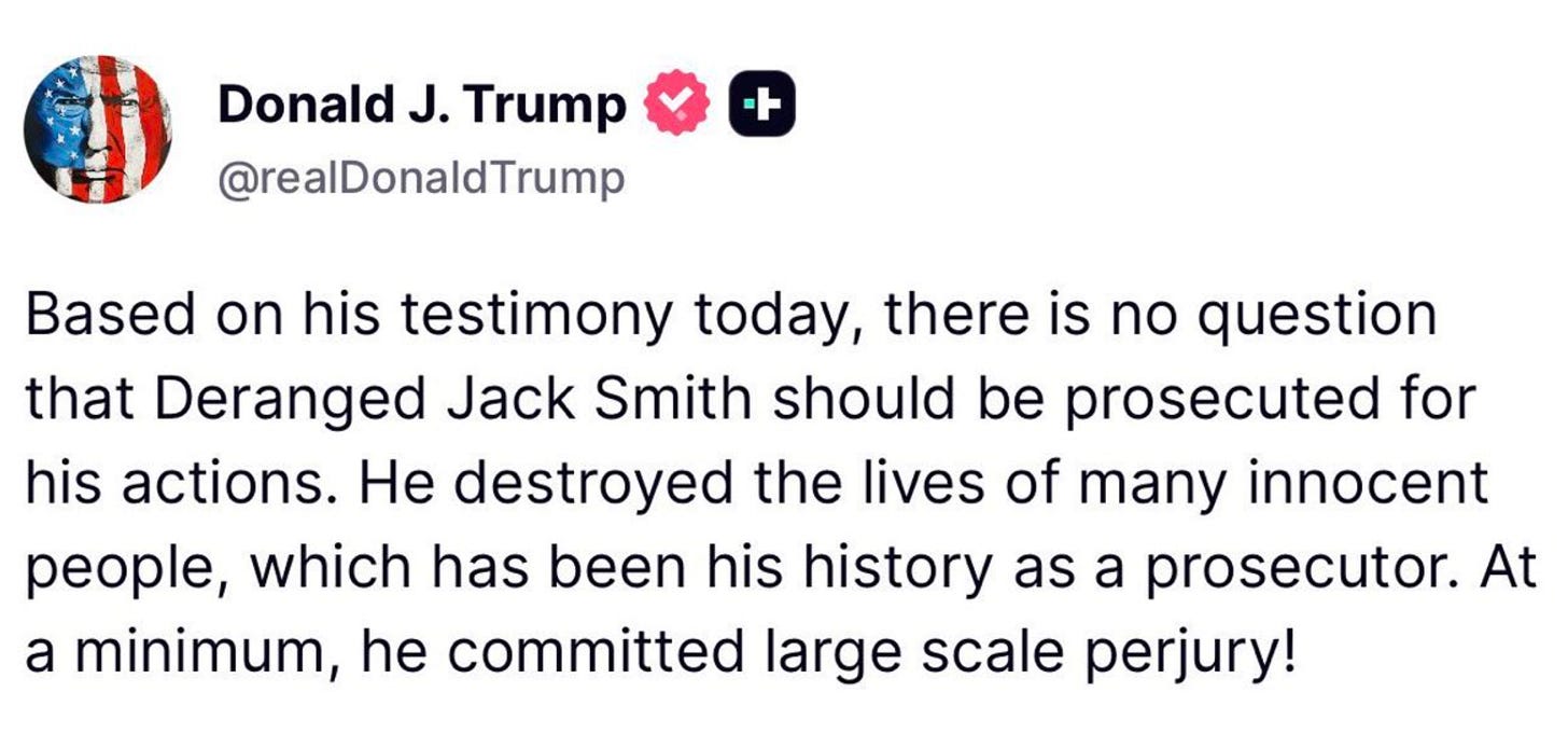 During Jack Smith’s testimony before the House Judiciary Committee this week, Trump fired off a Truth Social post where he called for Smith to be arrested and prosecuted.