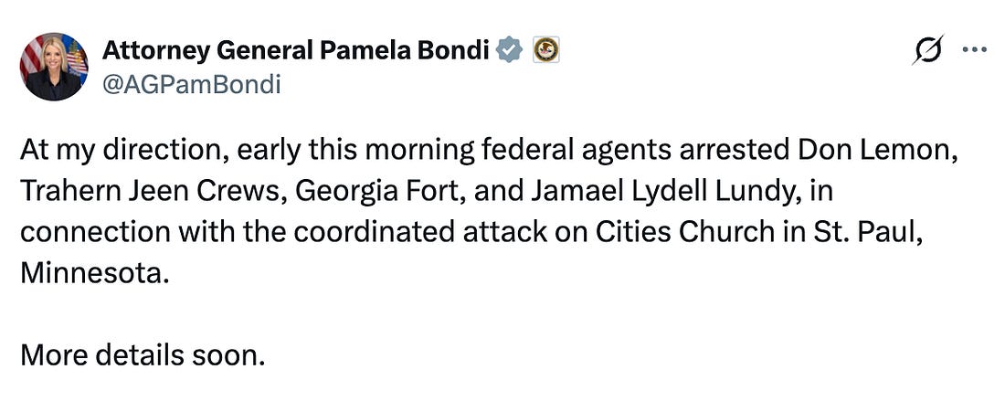 It remains unclear what crime Lemon is even accused of committing, and that uncertainty is not a bug, it’s the feature — arrest the target first, intimidate them publicly and justify it all later, if at all.