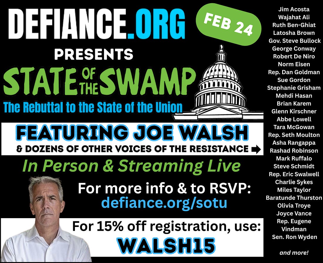There are so many jerks this week, it’s hard to keep track. As our amazing Olympians wrapped up an incredible Winter Games in Italy, FBI Director Kash Patel used the FBI jet to fly in and party with the gold medal-winning men’s hockey team. This is far from his first time jetsetting around on our dollar. Totally normal, above-board activity for an FBI Director. Meanwhile, White House economic adviser Kevin Hassett said the authors of a New York Fed study that validated that, yes, tariffs are a tax, and Americans are paying for them, should be “disciplined.” So if an independent group’s research runs counter to what Donald Trump claims, that’s worthy of punishment, according to Hassett. Utter bullshit. When asked what would happen with tariff proceeds that have been collected now that the Supreme Court has ruled against them, Treasury Sec. Scott Bessent said any refunds would amount to “ultimate corporate welfare.” He laughed at the suggestion that they may flow directly to the American people. Jerky, but honest. FCC Chairman Brendan Carr seems to have taken it upon himself to reinstate the Equal Time Rule for talk shows. The rule requires broadcasters who feature political candidates to provide airtime to rivals as well, but talk shows have traditionally been exempt. Until this week. Carr initiated enforcement action against both Stephen Colbert and The View for featuring Senate candidate James Talarico. Carr is unequally applying the Equal Time Rule, however, since Texas Attorney General Ken Paxton, also running for Senate, was interviewed on Sean Hannity’s radio show. And finally, there’s Health and Human Services Sec. Robert F. Kennedy, Jr., who not only revealed on a podcast that he used to snort cocaine off toilet seats but posted a workout video with Kid Rock that must be seen to be believed. This Past WeekMy Substack Lives are open to all subscribers, unless noted. Click below if you missed any of my conversations from the past week! THE SOCIAL CONTRACT IS THE PREMIER RESISTANCE COMMUNITY ON SUBSTACK, AND JOE WALSH IS THE VOICE OF THE RESISTANCE.ARE YOU READY TO FIGHT TRUMP’S FASCISM WITH JOE AND THE SOCIAL CONTRACT TEAM?Amid the daily onslaught of infuriating news, we have to acknowledge the heroes among us. The list continues to grow, as more and more of us stand up to the tyrant and his fascist regime. Courage is infectious. Be brave!