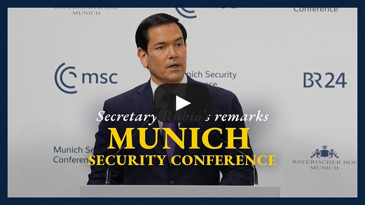 Second, it was a better, friendlier speech than JD Vance’s. Is that an extremely low bar? Sure — but Rubio cleared it! DW Chief International Correspondent Richard Walker said, “Rubio’s message was much warmer in its tone, it was really trying to pull on European heartstrings to try and create a sense of common purpose, to create, almost, a unified theory that links security to a different idea of ... the West. A lot of people [sat MSC] do seem to be relieved that it wasn’t guns blazing like JD Vance.” Furthermore, Rubio did not make the same attacks on European free speech policies that Vance did, nor did he meet with the AfD party afterwards.²